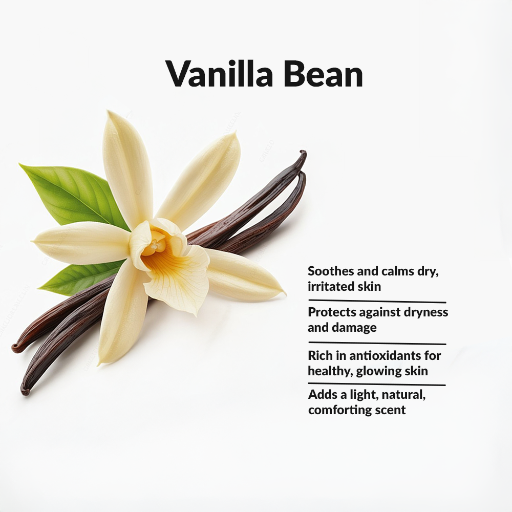 Vanilla Bean – The aromatic seed pods of the vanilla orchid (Vanilla planifolia), known for their soothing and antioxidant properties, enhance skincare products with a pleasant fragrance and skin benefits.